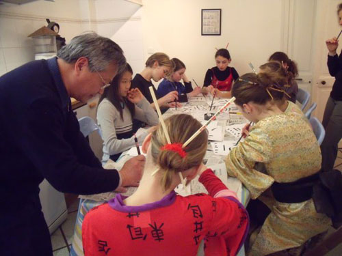 2月27日下午参加生日聚会的朋友们都早早来到了博莉娜的家,聚会的主角博莉娜这天打扮得特别漂亮,特地穿上了中国旗袍。她的这帮小朋友们也都个个穿着亚洲特色服饰,有穿日本和服的,有穿越南旗袍的,有在脖子上戴小佛像的,最有趣的是不少姑娘的发髻上还插上两根中国筷子。孔子学院老师的到来引起了生日聚会一个欢乐的小高潮,在孩子们好奇和惊讶的的目光下,中国老师从包里像变魔术一样把准备好的笔墨纸砚文房四宝一件一件地掏了出来,每掏出一宝都用法语深入浅出地讲解一番,孩子们听得非常认真,还边听边记笔记。最后老师发给每人一支毛笔。还没等书法老师正式上课,孩子们便举着毛笔迫不及待地在空中比划起来,场面好是热闹。