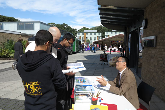 孔子学院分别在人文与艺术学院、管理学院及孔子学院分别设立展台,介绍孔子学院的汉语学分课程、各级各类奖学金(包括孔子学院奖学金)、赴华“汉语与中国文化夏令营”等项目,同时,组织汉语学分课程宣讲会和汉语体验课程,并邀请音乐团组More Music进行中国传统乐器现场演奏,邀请英国本土舞狮团Northe Dragons进行舞狮、武术、剑术、棍术等表演。近八千名高中生及其家长参加了此次活动。丰富多彩的现场展示和文化活动引起了众多学生及家长前来咨询,纷纷表示希望能够亲身参与到汉语学习和中国文化活动中来。