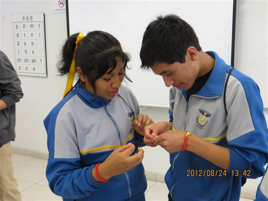 穿针是七夕节习俗,我们希望天上的仙女给自己聪明的心灵和灵巧的双手,所以七夕节又叫穿针节。志愿者教师赵鹏和高君带领大家做了一个穿针的游戏。大家两两组队,踊跃参加。在规定时间内穿针数量最多者获胜。游戏分为两轮:情侣组和朋友组。两组的获胜者都获得了象征吉祥的中国结手链。