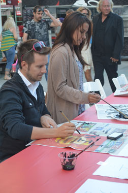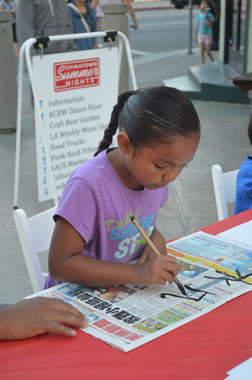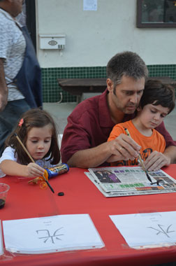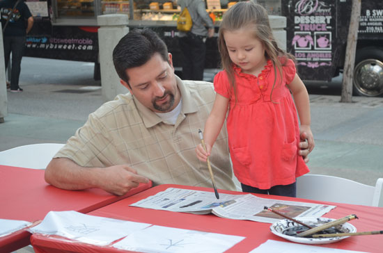 中国书法演示活动安排在中国城西广场举行,孔子学院摆放了有将近30个座位的长桌,桌上搁好毛笔、墨汁、纸和供临摹的汉字。这些汉字的笔划简洁、特征明显,上面还专门标注了笔划的先后顺序以及英语注释,便于初学者记忆和模仿。下午五点开始,前来参加“夏之夜”文化活动的人们,络绎不绝地进入中国城。孔子学院教师们认真的演示和生动的讲解很快吸引了很多美国市民。他们先是驻足观看,随后就大胆地提起毛笔,饶有兴味的临摹起来。可能是出于新鲜和好奇,在临摹的过程中,这些美国市民不断提出各种有关中国的问题,孔子学院的教师们都一一耐心回答。不少人边写汉字边表示,他们对中国文化非常感兴趣,并用简单的汉语与孔子学院教师和工作人员对话,希望今后有机会去中国;特别是一些带着孩子的家长,在桌前一坐就是半个小时,不断鼓励自己的孩子尝试用毛笔写汉字,还把孩子稚拙的“书法作品”小心翼翼地保存好,留作纪念,而且纷纷拿出相机,记录下这极有意义的瞬间。书法演示现场人数最多时,30个座位全部坐满,孔子学院教师一刻不停地来回示范、答疑,但还是常常顾此失彼,无法满足所有人的求知欲望。一直到晚上8点演示活动结束时,仍然有一些人来到活动现场,要求教他们如何用毛笔写汉字。美国市民和游客对中国的书法艺术如此感兴趣,学习热情如此之高,确实是始所未料的。