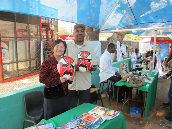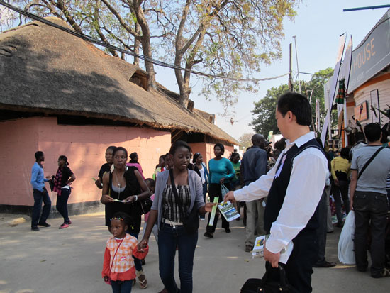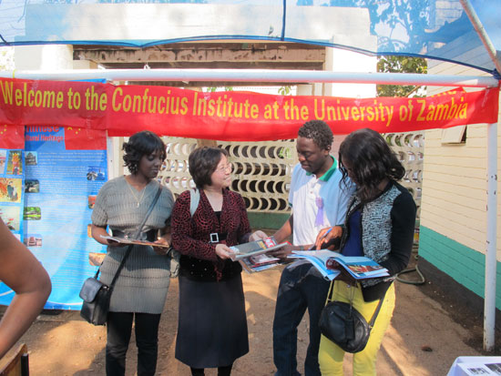 非洲地区农展会每年八月初在赞比亚举办。届时,来自非洲各个国家和地区的人士齐聚农展会,推荐自己的商品,是赞比亚参加人数最多、场面最宏大、气氛最热烈的盛会。孔子学院与赞比亚大学合作,提前布置好展台:展台后面是介绍中国建设成就和民俗文化、图文并茂的展板,墙上悬挂着红红的中国结和京剧脸谱,展台上摆满孔子学院的宣传册、杂志及汉语班、武术班报名表。
