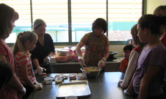 玉龙港公立中学资深助教Jenny在教授如何做饺子