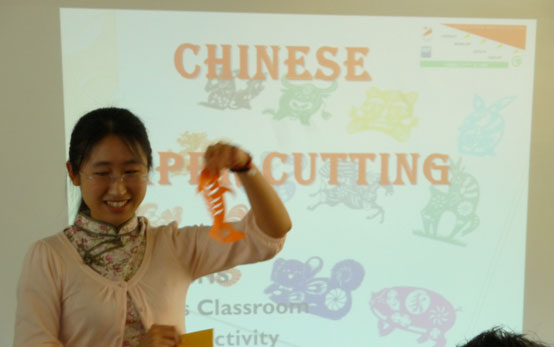 昆士兰州首位汉语教师志愿者马敏瑜在教授剪纸
