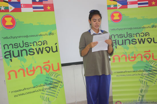 活动以“东南亚国家的发展”为主题,面向华欣学校高二、高三年级征稿,并请学生们以朗诵的方式向广大师生展示,共83名学生参与其中。素攀孔子学院公派汉语教师、汉语教师志愿者担任评委,分别就朗诵过程中语音的准确性、内容的承接性及朗诵时的仪态仪表逐一为学生们点评。活动中发现了一批在汉语写作及朗诵方面有潜质的优秀学生,他们流畅的表达、清楚的发音引来广大师生的阵阵喝彩;同时,活动中也总结出不少泰国学生汉语书面及口头表达中存在的典型问题,被素攀孔子学院教师们一一记录下来。