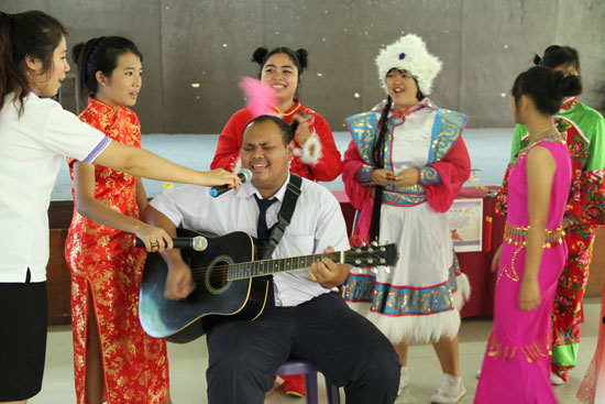 每天中午,曼松德孔院的教师都在校园摆开展台,带有丰富中国元素的宣传品立刻吸引了路过的同学。每个项目的负责老师不仅展示了相应项目的特长,更热情地把才艺地教给围观的同学。热衷于太极拳和太极剑的多是男生,一板一眼地学起老师的一招一式。而女生大部分喜欢中国民族舞蹈,在跟随老师学了一些简单的舞蹈动作后,她们甚至穿起孔院的民族服装,走上舞台初试锋芒,还学会了歌曲《歌声与微笑》。更有一位男生,抱着吉他自弹自唱一曲《甜蜜蜜》,赢得掌声无数。