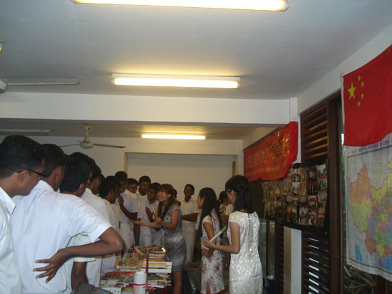 为了斯里兰卡Senanayake College男子中学新汉语教学点开班做宣传并造势,九月七日,斯里兰卡凯拉尼亚大学孔子学院的教师们在院长侯万春的带领下在D.S.Senanayake College男子中学举办了首次“中国日“活动。当天在Senanayake College男子中学的展览厅,中国国旗,中国地图,中国结,大红灯笼,脸谱,中国印象图片,太极拳学习图解,孔子学院简介,汉语有声教学挂图,汉语电子图书, 中小学汉语教材和中国文化书籍, 凯拉尼亚大学孔子学院汉语教学和中国文化活动图片,中国电影, 中国歌舞…处处都弥漫着浓浓的中国情。为配合“中国日”活动主题,展示中国传统服饰,凯大孔子学院的女教师们还专门穿上了旗袍,让学生眼前一亮。参加这一活动的师生约千人, 极大地激发了该校师生们学习汉语,了解中国文化的热情和兴趣。
