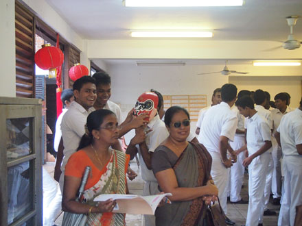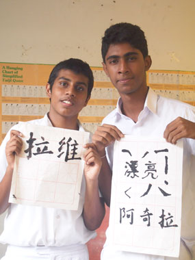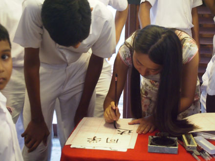 在“中国日”活动上,凯大孔子学院教师们向来访者介绍了孔子学院汉语教学课程和中国文化活动项目,教授来访者汉语词语和日常汉语,给学生取汉语名字,教学生体验使用汉语有声教学挂图和汉语电子图书,教写毛笔字,教剪纸,教下中国棋, 开展中国百科知识抢答赛, 介绍中国歌舞和太极拳,展示中国传统服装旗袍, 展播中国电影和歌舞。D.S.Senanayake College男子中学学生们尝试用毛笔写汉语教师刚刚给取自己的汉语名字, 学剪中国结,学下中国棋,体验使用汉语有声教学挂图和汉语电子图书学说中国话, 学唱中国歌, 试戴京剧脸谱。还有的学生表示要把自己的书法和剪纸作品带回家展示给爸爸妈妈。在孔子学院教师们的指导下,Senanayake College男子学校的师生们在充满乐趣的体验汉语文化过程中,品味了博大精深的中华文化。