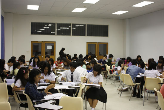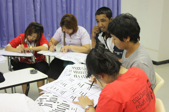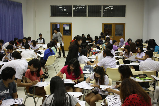 下午五点,宋卡王子大学董里分校L1113教室人聚集了来自全校近十个不同专业、不同年级的百余名学生,他们冒着大雨前来参加本次书法活动。大多数的学生第一次接触中国书法,也是第一次写毛笔字,他们带着强烈的好奇与求知欲望来了解和练习,并表达对中国书法由衷的欣赏。在志愿者教师的教导下,他们从握笔姿势开始,一笔一划,潜心写起毛笔字。活动持续了两个多小时,学生们仍旧意犹未尽,纷纷表示希望汉语社团能继续并定期组织学写毛笔字,表达了对中国书法浓厚的兴趣与喜爱。