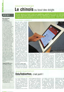 2012年9月出版的法国杂志《科技都市》(Technopolitaine),整版介绍了普瓦提埃大学孔子学院与法国国家远程教育中心共同合作推出的“酷中文”(Chinois Evasion)的汉语学习软件试用版。该软件目前适用于iPhone和 iPad。用户可直接在app store 免费下载。软件内容包括文化与语言两大板块,通过拼读、书写、释义等模块,以场景对话为方式,让学习者通过能够轻松快捷地学汉语。该软件特别适用于商务人士和游客,让他们在中国办公旅游时,快捷地学习中文常用语。