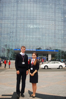 萨沙与达莉亚此次为来自中国中央电视台的新闻节目主持人劳春燕一行的媒体代表团担任翻译。他们陪同代表团对大会、城市建设及市民生活等进行了采访,在几天的辛苦工作中,顺利完成了汉语翻译的任务,还得到了代表团的好评。