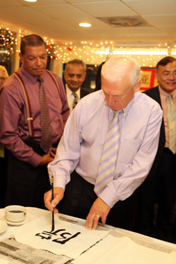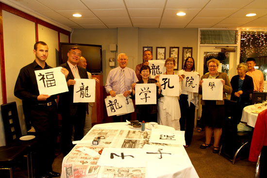 首场书法推介活动于9月13日下午5点在圣地亚哥州立大学文学院开始举行,圣大孔院美方院长与文学院院长Paul Wong教授、美方管理院长刘丽容博士、中方院长卢伟教授以及相关院系的教授、本地华社名流、媒体朋友等二十余人参加了活动。圣地亚哥郡的最高行政长官朗•罗伯特(Ron Roberts)先生专程拨冗光临观赏,并向周斌教授颁发了致谢书,感谢他前来圣地亚哥郡介绍和演示中国书法艺术。接着,周斌教授简要地介绍了中国书法的特点、演变、文化蕴涵,以及练习书法对于平和心态、调节情绪的养生价值,然后现场挥毫泼墨,引起了来宾的极大兴趣。不少客人禁不住纷纷提笔书写,罗伯特郡长也兴趣勃勃地临摹了“龙”、“院”等汉字,博得现场掌声阵阵。