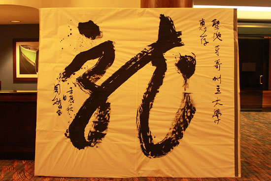 最后一场书法演示于9月15日下午5点半左右进行,时值圣地亚哥亚洲传统协会举办第九届“亚洲传统奖”的颁奖仪式。周斌教授做了现场书法表演,在一块宽20英尺、长25英尺的纸板上,一气呵成地写下了巨大的“龙”字,博得400余名观赏者赞叹不已。颁奖仪式结束之前,他还应大家的要求,另外书写了“精”、“神”、“气”三个大字,并将象征华人华侨为“龙的传人”的“龙”字巨幅书法作品赠予圣地亚哥州立大学留念,