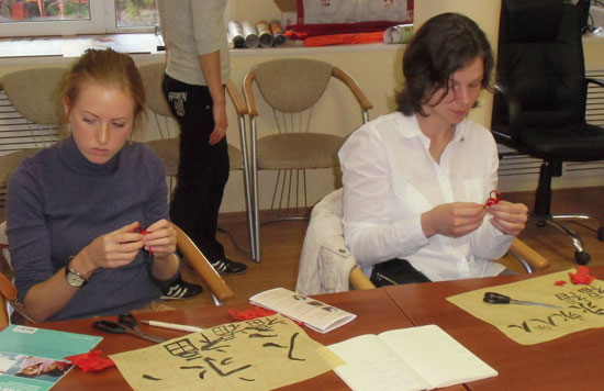 孔子课堂俄方副院长尤莉娅.阿扎连科、中方院长朱晓军及汉语教师、汉语教师志愿者均参加了这次活动。汉语爱好者们先是参观了孔子课堂,多媒体设备让他们体验了一把“空中课堂”。活动正式开始后,俄方副院长尤莉娅.阿扎连科先向前来参观的各位汉语爱好者们介绍了孔子课堂的基本情况,包括汉语教学、成果展示和设施介绍,汉语爱好者们感受到了在这里学习汉语的便利之处。接下来的中国文化体验让他们对汉语有了更浓烈的兴趣:先是听汉语教师志愿者毛敏对中国文化元素中的文房四宝、扇子、书法、中国结、剪纸、风筝等的介绍,接着在汉语教师志愿者陈雷振的帮助下,写下自己的第一幅“墨宝”,爱好者们不少人都有学习汉语的天赋,一下手便是像模像样,笔画也很正确;然后大家又跟着汉语教师薛颖开始了剪纸,令人叫绝的是剪得最快最好的是一位已经工作了的男士,连一旁的女孩子也惊呼不已;随后汉语教师志愿者肖亚兰教爱好者们怎么样做双钱结,别看小小的中国结,也难倒了好几个人,但是“心灵手巧”的男士又成功地自己完成了,现场笑语连连……最后所有人一起按照俄罗斯习俗“喝茶”,大家围坐在一起交流,有爱好者提出自己的问题,表达想要学习汉语的欲望。这个“开门日”在美好愉快的氛围中结束了,孔子课堂向外界展示了自己的魅力,有更多的人成为了汉语爱好者,或许他们之中的很多人会变成汉语学习者,让这门美丽的语言传播地更广更远……
