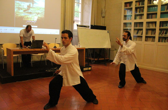 文艺表演是由汉语志愿者老师和学员们一起准备的。节目精彩纷呈,有二重唱,诗歌朗诵、书法表演等、值得一提的是由比萨孔子学院院长陈镛女士和比萨大学学生合唱的一曲《bella ciao》,他们分别用中文和意大利文两种语言演唱,整个会场的观众也跟着歌声一齐拍手,喝彩,场面热闹非凡。文艺表演节目中,还穿插了两组游戏,分别是《传递水杯》和《正话反说》,观众们都踊跃参加,将节目推向了高潮。节目的最后,livoo功夫学校的学员们还给我们带来了振奋人心的醉拳、太极拳以及长棍表演。晚会在一片喝彩声中落下了帷幕。