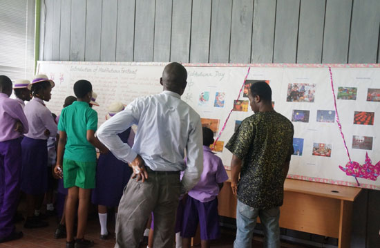 宣传活动从上午开始一直持续到夜里,拉各斯大学孔子学院的志愿者教师们各司其职,每一个环节都进行得有条不紊。他们播放中秋文化宣传片,设置中秋文化知识及民俗传统展板,让当地师生全面了解中国的中秋传统节日的历史和民俗。除了文化展示,当地师生还可以在了解中秋文化知识之后参加关于中秋节的问答活动,回答精彩或正确就能够得到奖品并有机会品尝月饼。观众们兴致勃勃地参观中秋文化展示,认真阅读中秋文化展板内容,许多人都有幸第一次尝到了中国月饼,对月饼独特的味道和口感赞不绝口。晚饭后,明月升起,师生们品尝着月饼并观看中国电影。在皎洁的月光下,大家团聚在一起,中尼友人其乐融融,别有一番风情。