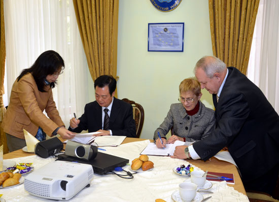 北京第二外国语学院周烈校长同莫斯科国立语言大学校长И.И哈列耶娃女士签署协议