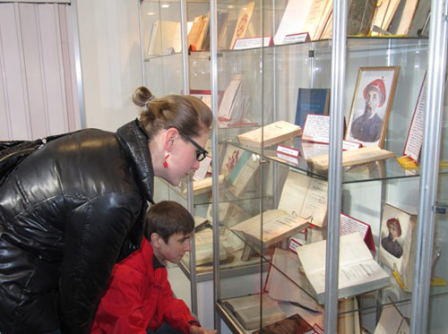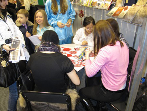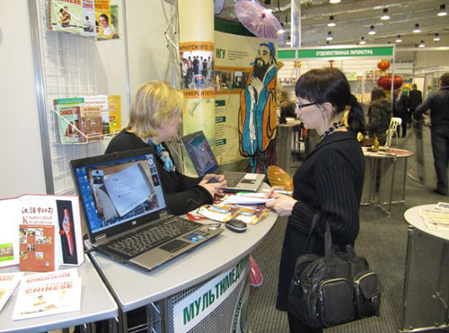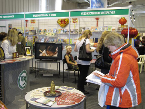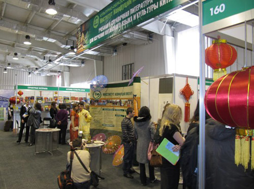 伊尔库茨克大学孔子学院院长及中俄汉语教师“精心设计、精心施工”,举办了一场具有浓厚中国语言文化底蕴的图书展。展台中央巨型的孔子像和孔子学院文字介绍浑然一体,既庄重典雅又具有宣传效果。展区内悬挂着具有中国特色的大红灯笼和宫灯,还有“福字”和传统的“中国结”。整个书展划分为10个展区:伊尔库茨克地区汉语言珍本图书(自1725年);辞书与工具书;中国历史与文化图书;HSK考试类教材;汉语语言文字类图书;文学作品类图书;儿童图书;音像制品;教学挂图;多媒体展台。参加此次书展的图书来源于3个渠道。第一个来源渠道是国家汉办,大部分图书是自孔子学院成立两年多以来国家汉办以不同的方式陆续为孔子学院教学、师资培训提供的教材、书籍和音像资料。其次,此次书展得到了驻伊尔库茨克总领馆的大力帮助,领馆提供了大批优质图书和画册,尤其是向参观者免费赠送的光盘,深受欢迎。第三个来源渠道是伊尔库茨克大学科学图书馆(州最好的图书馆)提供的汉语言文化珍本书籍和本土汉学家的研究成果,记载着伊尔库茨克地区与中国语言文化交流的历史。这个别具特色的封闭式展台吸引了很多参观者。