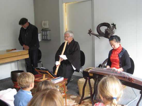 演奏会主要由三人演出:Behard Mayer先生用德文朗诵与龙相关的诗歌,Gerhardt Staufenbiel先生演奏日本传统乐器尺八,孔子学院特请的王欢欢女士演奏古筝。Behard Mayer先生那富有磁性的嗓音很快便把听众带入到诗的境界,而后尺八那哀伤的声音尾随而至,正当听者还沉浸在幽怨的氛围之中,古筝那清脆且欢快的音响又将大家送入另外一种心境。尺八和古筝这两种性情相斥的乐器各自向大家展现着生之哀怨和生之喜悦,奇妙的是乐曲没有凸显冲突,反而有一种和谐,倒像那阴阳协调一般,充满了东方哲学的韵味。