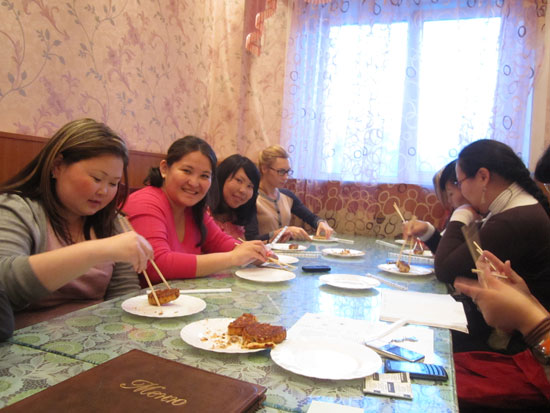 为了提高初级汉语学习者的学习兴趣,结合学生学习的内容进程和水平,在中、俄教师共同组织下,别具一格地在当地的一家中国餐厅开展了“品月赏月”的活动。中秋月圆之际,活动伊始,中、俄教师分别向学生介绍了中国中秋节和国庆节的由来、性质、改革开放以来的发展及其庆祝方式,并共同品尝了中秋传统美食—月饼。