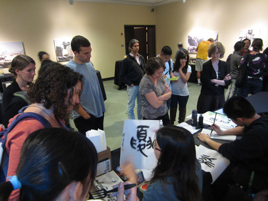 俄勒冈大学孔子学院的老师们还专门设立了书法艺术体验展台,手把手地教兴致盎然的朋友们练习书法。“写好它比看起来要难多了,不过很有意思!”看着自己的劳动成果,他们开心地举起作品跟老师合影。