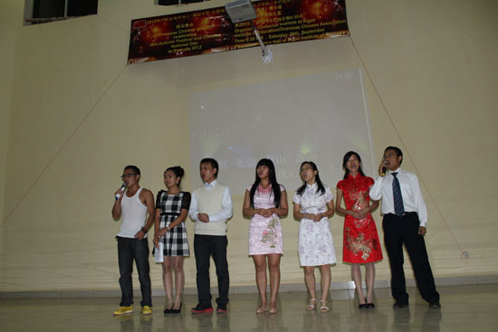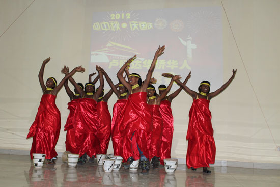 本次活动以孔子学院武术班学员的功夫秀为暖场,博大精深的中华武术在黑色皮肤的卢旺达人身上亦有非凡的表现,赢得了台下观众热烈的掌声。活动以大使舒展阁下的讲话正式开始,他提到了中国和卢旺达的许多共同之处,中国在几十年间发生了翻天覆地的变化,他相信卢旺达人民也可以做到。接着,舒展大使为“中国-卢旺达和平统一促进会”揭幕。之后,全场观众全体起立共唱中华人民共和国国歌,激扬的《义勇军进行曲》飘荡在异国他乡的天空中。此后是中卢友谊学校的卢旺达北部省女子中学的学生为大家带来的优美的卢旺达舞蹈,鼓声震耳、歌声嘹亮、舞姿动人,让我们深切地感受到了卢旺达人民的热情与对生活的热爱。此后,各中资公司的人员演唱了许多中国歌曲,有《但愿人长久》、《牵手草原》、《蒙古人》、《海阔天空》、《青藏高原》、《突然的自我》、《十月是你的生日》等。歌曲之间穿插着卢旺达艺术团的舞蹈表演,京剧、太极扇、朗诵、时装秀以及葫芦丝演奏等。