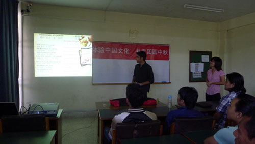 孔子学院教师制作了精美的幻灯片,利用投影仪图文并茂地向尼泊尔学生介绍了中国传统节日中秋节的文化背景知识。从中秋节的起源出发,让学生们了解了后羿射日以及嫦娥奔月的神话故事。并以丰富多彩的图片以及视频向学生们展示了中秋节的传统习俗如全家赏月以及吃月饼等,使尼泊尔学生对中国的中秋节文化有了一个比较深入的了解。