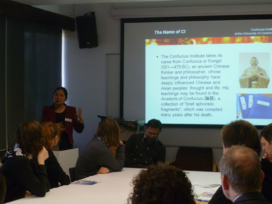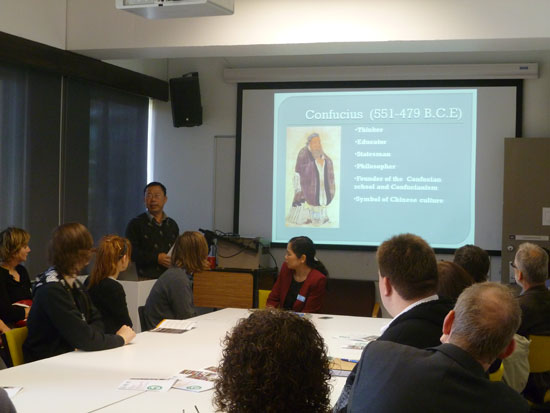 2012年9月28日上午,坎特伯雷大学孔子学院在现代语言楼401室成功举办了孔院论坛系列研讨会之“解读《论语》”。此次研讨会是专门为参加新西兰哲学教师学会2012年会的成员而举办。新西兰哲学教师学会的主席杰•斯洛斯和近30多位哲学教师和学生出席了研讨会。此次研讨会的主讲人为北京语言大学李立成教授和坎特伯雷大学人文学院的讲师宋志方博士,研讨会由孔子学院中方院长胡泓主持。