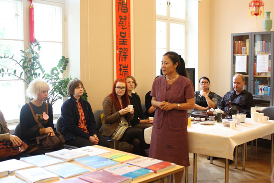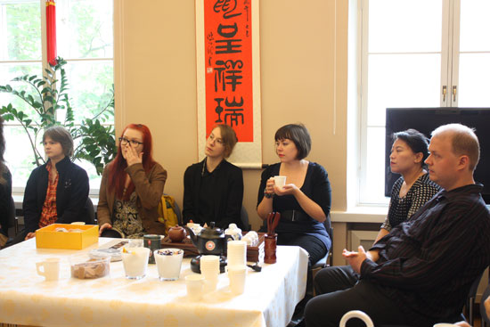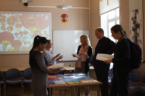 前来参观咨询的大部分学生来自赫尔辛基大学东亚学系刚刚入学的新生,也有六十年前就与中国结缘的耄耋老人,还有来自其他国家的交换学者,约有四十余人。首先由孔子学院中方院长李远征简要介绍孔院,介绍本学期即将开设的课程,计划举办的文化活动与汉语水平考试,人民大学和汉办奖学金相关信息。前来咨询者或者向老师询问课程安排、学习用书,或者就汉语学习技巧进行交流。李远征和马莉娜老师们对他们的提问都一一进行了解答。来自中国人民大学交换学生撒莉(2010年)也在场帮助回答了汉语学习的问题。大家一边品尝中国小吃,一边交流,气氛十分融洽。