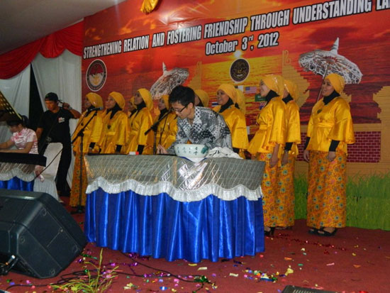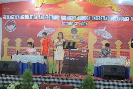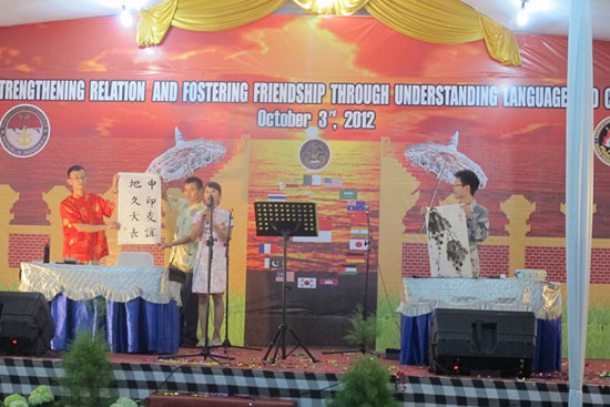 2012年10月3日晚,印度尼西亚阿拉扎大学孔子学院应邀出席印尼国防部语言教育与培训中心举办的2012年度“国际之夜”活动。阿拉扎大学孔子学院志愿者教师与合唱团的学生共同为在场的400余名嘉宾献上了一场精彩的演出。