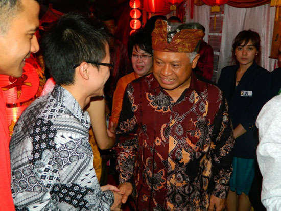 国防部部长Puomo Yusgiantoro与孔子学院志愿者教师握手