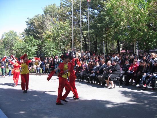 10月1日 ,“孔子学院双节系列活动开幕仪式”在孔子学院楼前隆重举行,吉民大吉中学院院长、孔子学院中吉方院长出席了开幕仪式。汉语专业的同学们用优美的舞姿、甜美的歌声和娴熟的汉语给在场观众展现了一场文化盛宴。路旁驻足观看的行人,充满喜爱和赞叹的眼神给同学们了莫大的鼓励。参加表演的同学大多为我院汉语培训班、中国文化培训班的学员,他们精彩的表演也是对中国老师的极大鼓舞和肯定。