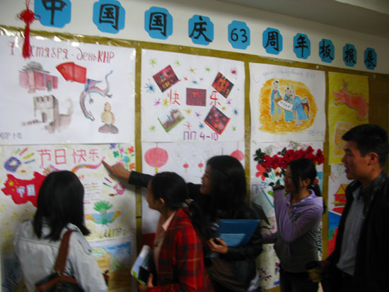 “国庆讲座”、 “中国剪纸、书画作品展”、“中国国庆63周年板报展”等活动在随后成功举办。深入浅出的讲解让同学们更加清楚地了解了中国节日文化;精致的剪纸、书画作品形成了一道亮丽的风景线;板报展中的作品更是极富中国元素。