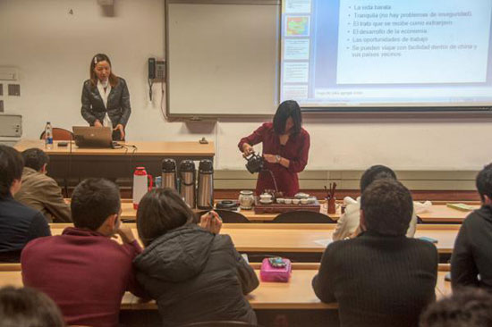 9月12日,安第斯大学国际学术交流处与孔子学院联合组织,由安第斯大学孔子学院中方院长张慧晶老师针对学习汉语的学生,介绍了中国的概况、中国的主要的大学、如何去中国留学,以及如何获得交流机会和奖学金,激发了汉语学习者去中国留学的兴趣,帮助他们解决了疑问。同时,来自南开大学的志愿者教师张潇逸给现场的听众朋友们展示了中国的茶艺,大家兴致勃勃地品尝了中国的绿茶。