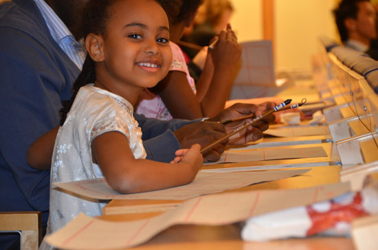 手握毛笔、兴高采烈的小朋友