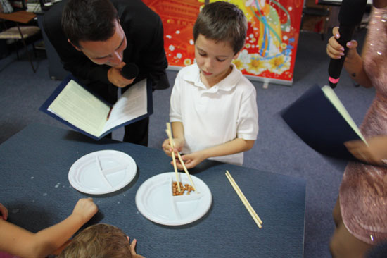 小朋友也参与到筷子夹花生游戏中来