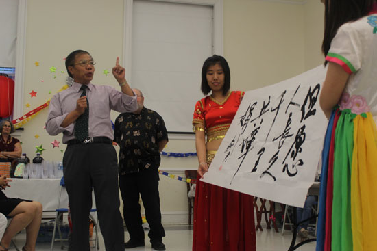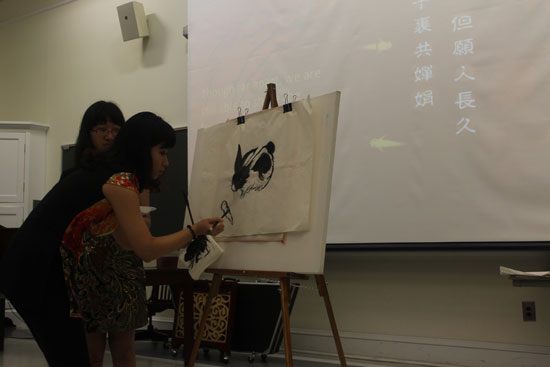 开场热情奔放的民族舞让美国观众赞叹不已。中方院长陈建国教授用幽默风趣的语言介绍了中秋节的传统、嫦娥奔月的传说,并对比了中、日、韩三国庆祝中秋的不同习俗。中方院长黄建军教授则现场挥毫写下“但愿人长久,千里共婵娟”,并饱含激情地朗诵了苏轼的名篇《水调歌头﹒明月几时有》。随后,伴着一曲《春江花月夜》,孔子学院师生捧剑起舞,表演了32式太极剑。留学生民乐团带来的弦乐合奏《最炫民族风》把晚会推上了高潮,古筝、琵琶、扬琴等民族乐器奏出的美妙音乐让现场的观众陶醉。