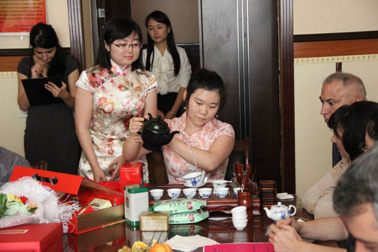 活动从介绍中秋节的习俗中展开,孔子学院的国家公派汉语教师首先介绍了中秋节吃月饼的习俗,品尝中国月饼让与会来宾感受到中秋节的浓浓气氛;志愿者教师表演了中国茶道,优美的古筝乐曲背景下的茶道表演,充分展现了中国文化的高雅与神秘;中学生学员的古诗词朗诵和高级班学员米娜演唱的歌曲《明月几时有》,彰显了中秋节的文化韵味。活动在国庆节的祝福声中转入高潮,外方院长亲手给每位嘉宾分切了写有“中国生日快乐”的蛋糕。最后,全体汉语教师和志愿者合唱了一曲《大中国》,豪迈和深情的歌声表达海外游子对祖国的热爱和祝福,并为此次活动画上圆满句号。