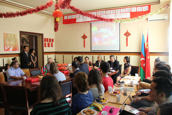 2012年9月29日,巴库国立大学孔子学院在多功能教室举行了“迎中秋庆国庆”联欢会。中国驻阿塞拜疆使馆的李勇慧主任、巴库大学外事副校长莎拉拉女士、里海大学校长哈姆雷特教授、阿总统策略研究室研究员拉沙德先生、阿《独立报》主编古丽哈丝女士等应邀出席了联欢会。应邀参加活动的还有中资企业代表、华人社团代表、留学生代表以及孔子学院东方学系汉语专业师生近百人欢聚一堂,共庆中秋佳节和国庆节。