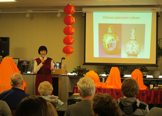 9月21日,中国瓷器文化讲座在阿拉斯加大学书店演播厅进行。孔院院长曾萍教授从中国瓷器融合书法、绘画和篆刻等艺术形式的角度作了独到的解析。主讲人茹佳佳则从瓷器的历史,制作工艺,形态及图案设计等方面对中国瓷器做了全方位的介绍和展示。席间还挑选了具有象征意义的五个陶瓷器皿来辅助讲演并帮助听众理解。整个讲座在祥和欢快的气氛中进行,安克雷奇的瓷器爱好者们进一步深入了解了中国瓷器文化的精髓,普通听众也对中国传统瓷器文化产生了浓厚的兴趣。