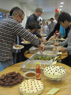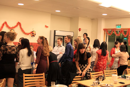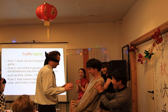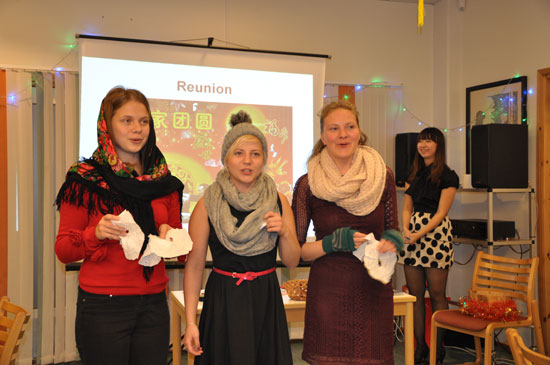 大家边吃着中国美食,边欣赏着节目。新加入汉语班的学生来了个精彩的集体亮相。两位挪威学生马丁和华拓根据课文内容自编自演了一个小品;另一组俄罗斯的三位姑娘,她们穿戴着喜气的冬装,带来雪花道具,朗诵表演了刚学的诗歌《雪景》。其他同学也争相上台,念新学的绕口令等。掌声和欢笑声一阵阵响起。