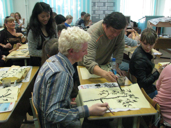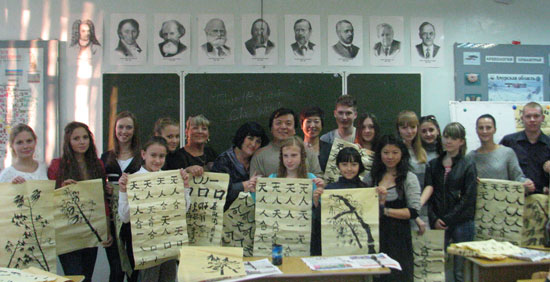 布师大孔子学院在常年开设汉语教学的同时,也不断地丰富中国文化课的内容。现开设的文化课有中国影视欣赏,剪纸,中国结制作及书法课。在书法课教学中教师注重将书法技巧教学与历代书法作品欣赏进行有机结合。通过书法教学既提高了俄罗斯学生对中国传统文化的了解,又培养了他们的审美情趣,同时也了解到中国书法的巨大艺术成就和思想价值。