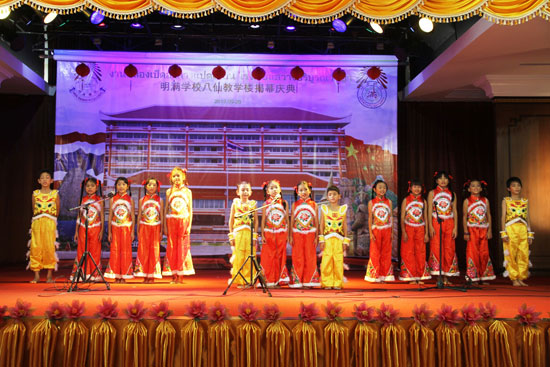 庆典伊始,由春武里府府尹乃空讪•亿甲猜先生致欢迎词,他对高振廷参赞和各位嘉宾的到来表示了热烈的欢迎,并预祝本次庆典活动取得圆满成功;随后,明满学校校董会主席秦初奇先生和泰国华文民校协会梁冰主席一起向高振廷参赞和各位嘉宾报告了明满学校八仙教学大楼的建设经过并向慷慨捐助的热心人士表示由衷的感谢;高振廷参赞代表管木大使为八仙教学大楼庆典致辞,他表示十分荣幸应邀参加此次揭幕典礼,明满学校是泰国东部地区的著名学校,八仙教学大楼的建成使用,将为学生们提供良好的汉语学习环境,推动泰国华文教育事业的发展,他祝愿学校越办越好,桃李满天下,致辞结束后高振廷参赞亲自为赞助筹建八仙教学大楼的热心人士颁发纪念盾;上午十时,高振廷参赞、乃颂他耶•坤本部长、乃空讪•亿甲猜府尹、吴宏丰主席和秦初奇主席等共同为明满学校八仙教学大楼揭幕和剪彩,随后嘉宾们一起参观了八仙教学大楼并观看了明满学校学生为本次活动准备的大楼揭幕志庆演出,高振廷参赞盛赞明满学校学生的中华才艺表演精彩夺目。