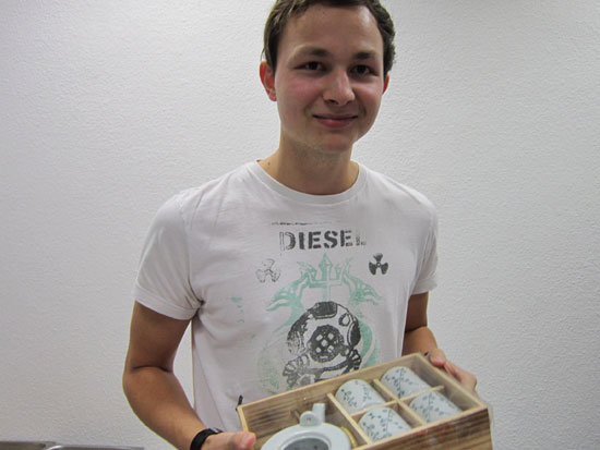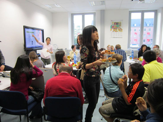 特里尔市是厦门市的友好城市,多年来两城之间的文化交流活动不断。今年中秋,孔院特地安排了中秋期间流行于福建闽南地区的传统活动--搏饼,并在中国超市购买了富有中国风味的点心以及茶具等作为奖品。孔院汉语教师唐月为大家介绍了厦门博饼活动的由来及游戏规则。她的介绍刚结束,心急的来宾就摩拳擦掌,争相投入博饼中。在肖宁遥和史洁菲老师的主持下,只见各桌骰子飞转,欢笑声此起彼伏。最后,每桌产生的“状元”聚集在一起,进行终极状元王PK,更是引得大家掌声不断、笑声一片。