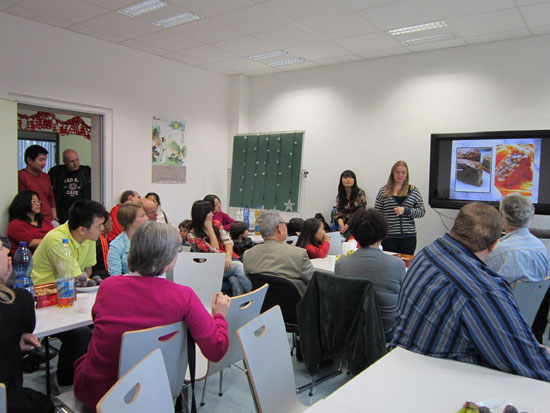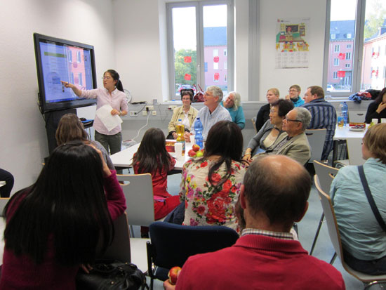 下午五点,活动正式开始。中方院长郭永穗代表孔院致辞。她感谢特里尔的学生和民众多年来对孔院工作的支持,并祝大家度过一个愉快的中秋之夜。接着特里尔Humboldt 高级文理中学的学生 Anna-Katharina介绍了中国传统节日中秋节、中国人过中秋的习俗以及中国古今文人关于中秋的名诗佳句。Anna-Katharina 学习汉语一年有余,热爱中国文化。她的介绍搏得了热烈的掌声。