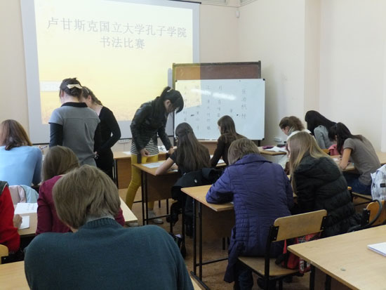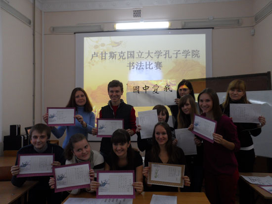 为纪念中国乌克兰建交 20 周年,进一步扩大汉语言文化的传播,激发学生书写汉字的热情,卢甘斯克国立大学孔子学院于2012年10月27日举办了首届汉字(软、硬笔)书法比赛。