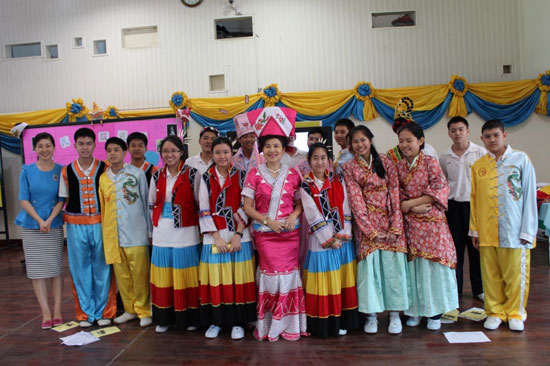 泰方负责人穿上民族服装与学生们共同体验中国的民族文化