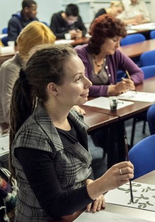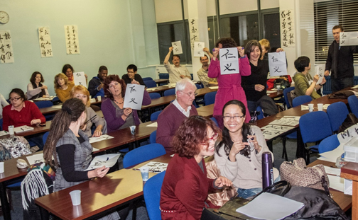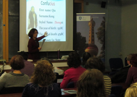 10月23日晚六时,50多名来自谢菲尔德市和附近城市的听众,怀着期待的心情,聚集在谢菲尔德大学Hicks 教学楼的一间教室里,聆听来自东方的孔子的学说。教室四周的墙上贴满了孔子的诸如“己所不欲勿施于人”、“有朋自远方来,不亦乐乎”、“三人行,必有我师”等的名言。谢大东亚学院的访问学者,来自中国浙江工商大学的王丽梅副教授,主攻中国古典文学、中国古代历史和中国古典戏剧,拥有多年在国内从事国学教学的丰富的教学经验,她从孔子的生平轶事、思想学说和名言摘录三个方面向英国的听众介绍了这位中国历史上最伟大的教育家、思想家和儒家学派的创始人。她以简驭繁,以仁、义、礼、智、信、忠、孝、廉、耻、勇、温、良、恭、俭、让十五个字向英国现场的听众介绍了孔子的思想学说,并与他们分享了孔子有关德行、教育、健康和和谐人际关系的名言,她为时一个小时生动有趣的讲座,不时引起现场听众阵阵的笑声。在王教授回答了现场观众的提问以后,谢菲尔德大学英语系的访问学者,来自江苏常州纺织服装职业技术学院外语系副主任杨善江副教授,开始带领现场的听众体验用毛笔书写孔子名言(仁、义)的乐趣,最后,谢大孔院还将杨老师书写的孔子名言赠送给现场的听众,整晚活动的安排融知识性和趣味性为一体,使人们度过了一个难忘和愉快的晚上。