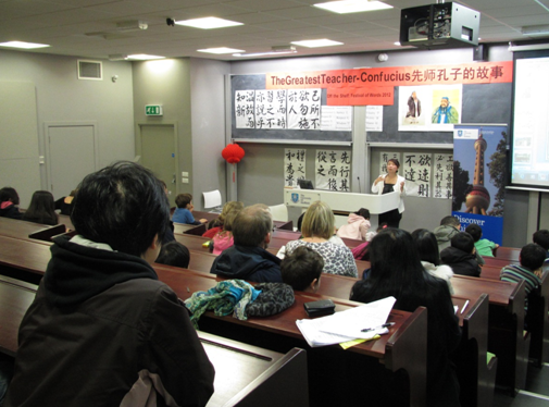 10月27日上午,谢大孔院又组织了一个面向当地5至14岁小学生的孔子故事会,50多名谢菲尔德市当地的小学生,在家长的带领下,赶来参加“先师孔子故事会”。在谢菲尔德大学Hicks教学楼的一间大教室里,谢大孔院的郭红老师为孩子们讲述了孔子出生时的传说,孔子与他的学生子路和颜回之间的故事等,郭老师绘声绘色的讲述,以及不时的通过提问与小听众们之间的互动,引起现场的孩子和家长对孔子产生了浓厚的兴趣,郭老师还通过一个个生动有趣的故事总结出故事中所蕴涵的意义,以此达到了以小学生们喜闻乐见的形式介绍孔子和其思想的目的。听完孔子的故事后,孩子们不仅学习了用毛笔字书写孔子名言,而且还体验了亲手用写有孔子名言的纸,学做红色折叠纸扇的乐趣,整场活动的安排循序渐进、寓教于乐、高潮迭起,受到现场小朋友们和其家长的普遍喜爱。