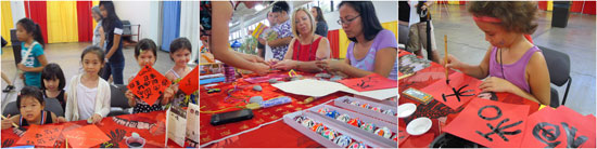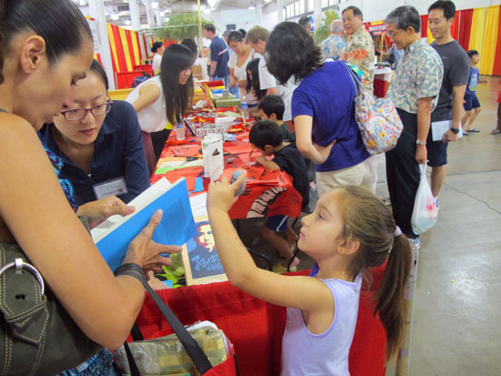 夏威夷大学孔子学院主要进行了中文教材和中国文化书展以及中华文化体验活动,吸引了大量观众。文化体验活动包括毛笔书法、用中文在小石头上写名字、剪纸、编中国结等,许多观众兴致勃勃地在红纸上写上了“福”、“安”等字、在小石头上用中文写上了自己的名字,并带走留念。