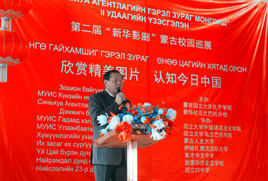 王小龙大使在致辞中表示,孔子学院和新华社强强联合,面向校园学生这一新生代群体,通过摄影图片这种最为直观和便捷的艺术载体,架起一座沟通的桥梁,这既是蒙古孔院“立足大学,服务社会”指导原则的有力实践,也是新华社推出的对外交流的优秀文化品牌。蒙古国立大学副校长/蒙古孔院理事长仁钦巴扎尔先生在讲话中强调,今年适逢蒙古国立大学建校70周年,孔子学院的各项文化活动成为丰富大学生活的一道亮丽的风景线。中文歌唱比赛、“汉语角”及文化讲座、图片巡展等一系列活动的成功举办不仅丰富了学生的校园文化生活,开拓了学生的视野,更增进了蒙古国广大师生对中国的了解。